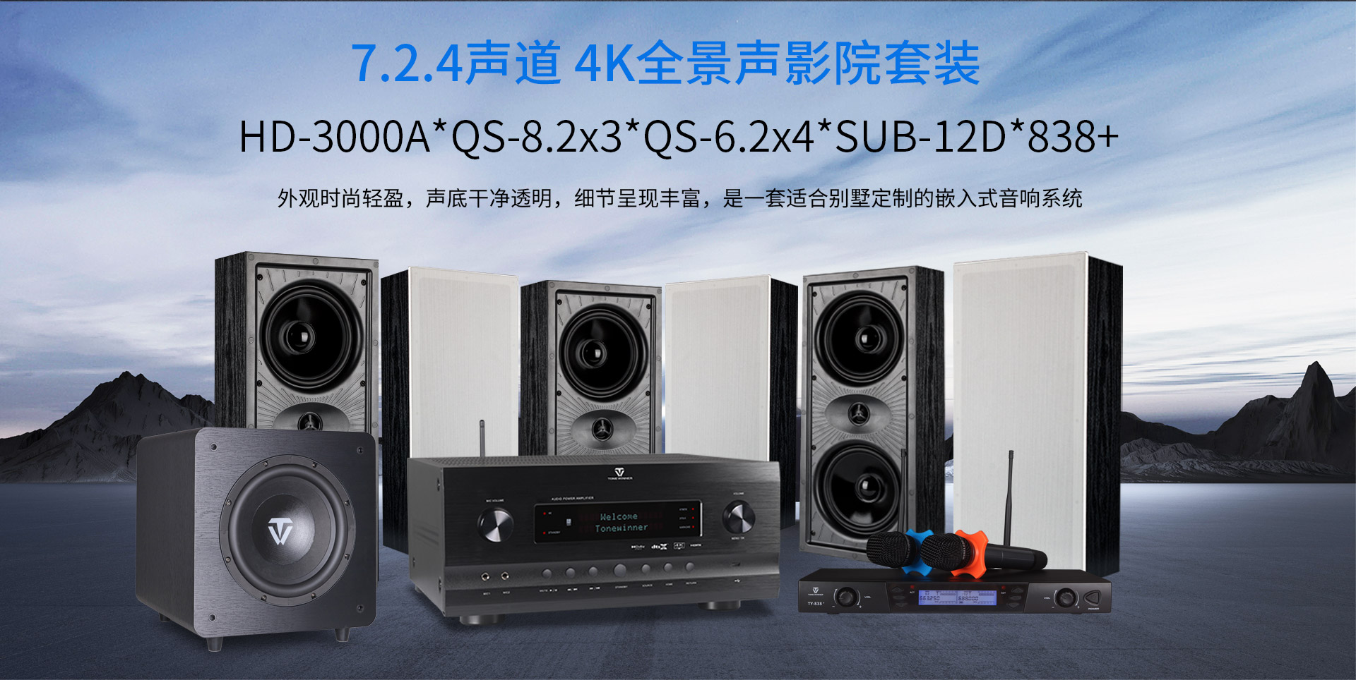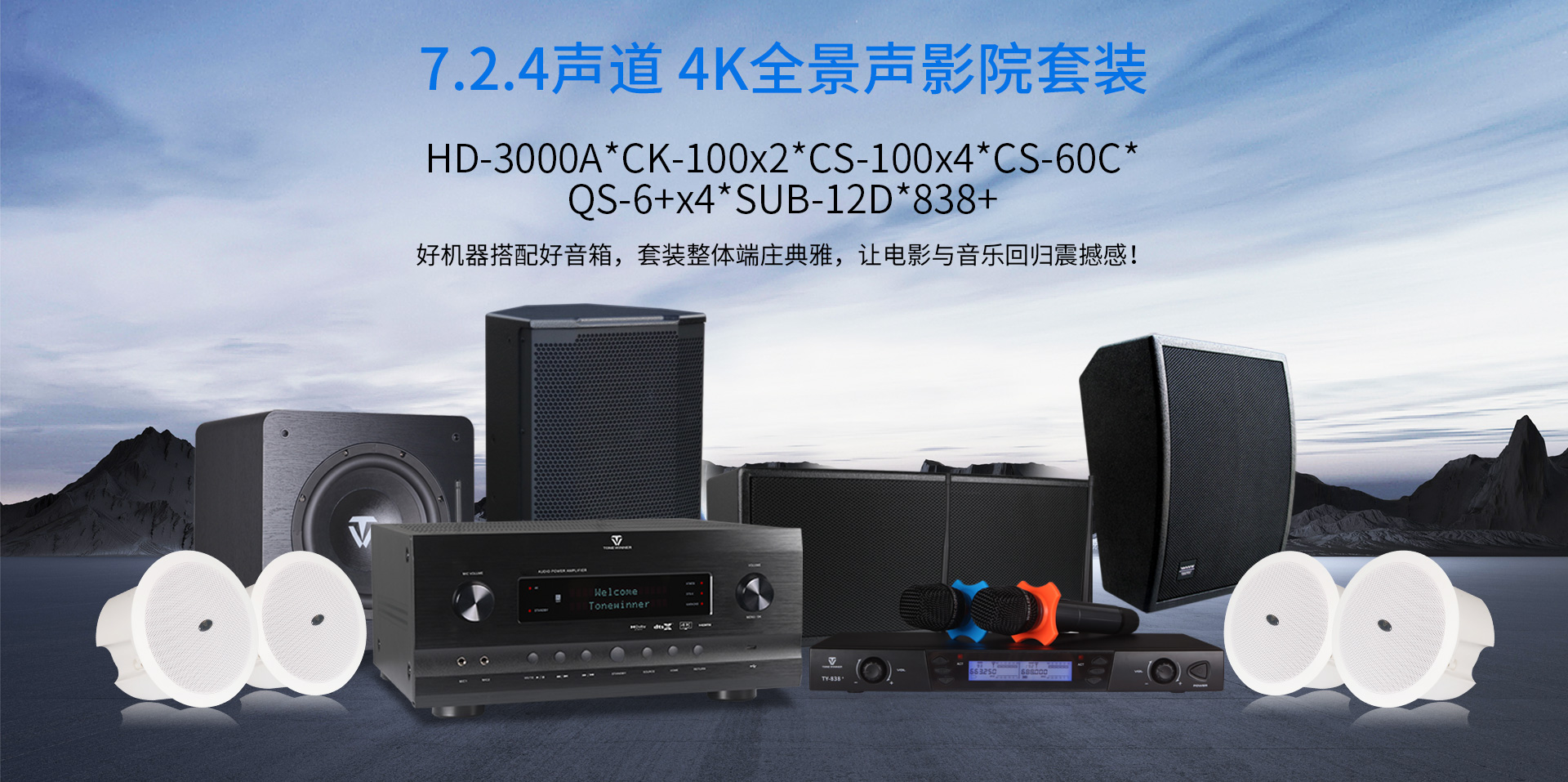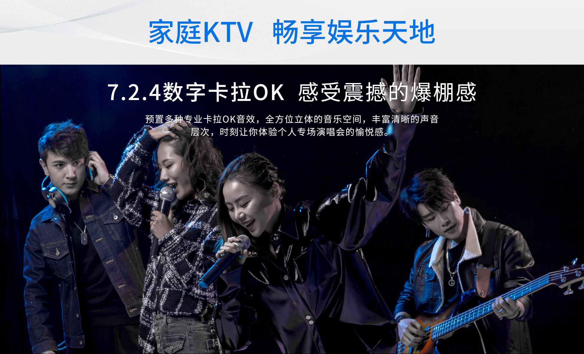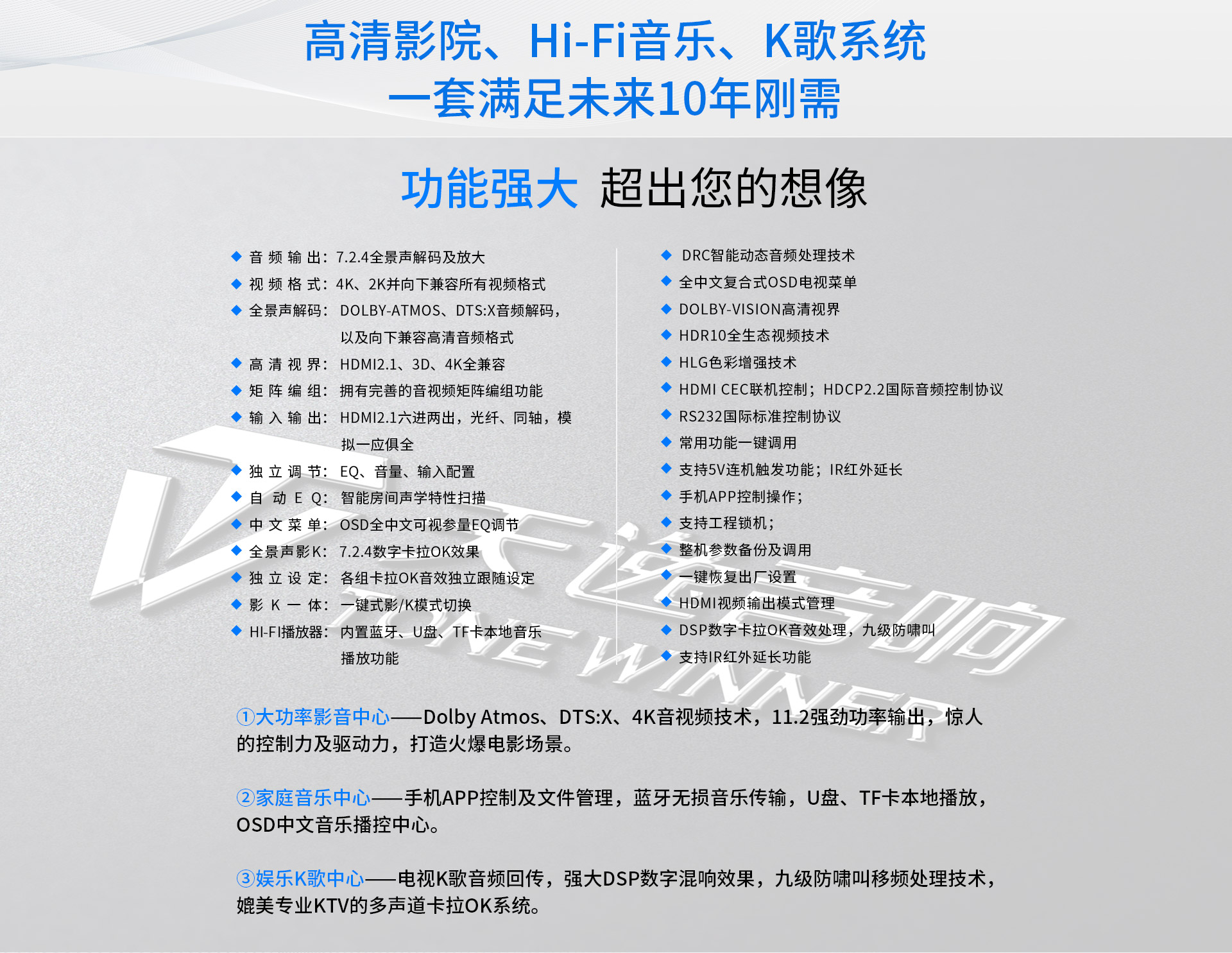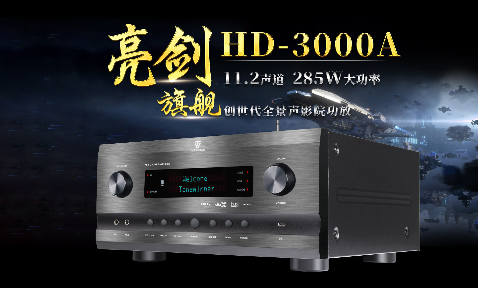 简介:HD-3000A是一款专为高端家庭打造“创世代”全景声影K一体功放。支持Doly Atmos全景声音效及DTS:X沉浸式音效并向下兼容,并且支持4K视频技术,兼容3D、HDR、Dolby Vision等视频格式;同时具有U盘、TF卡本地播放功能,支持多种无损及高压缩音频格式。手机APP控制、蓝牙无损传输,专业级7.2.4声道沉浸式卡拉OK效果领先国内外;让家庭影院/KTV走进生活。同时兼容ARC音频回传,是一款可全面满足家庭娱乐的高端影音一体机