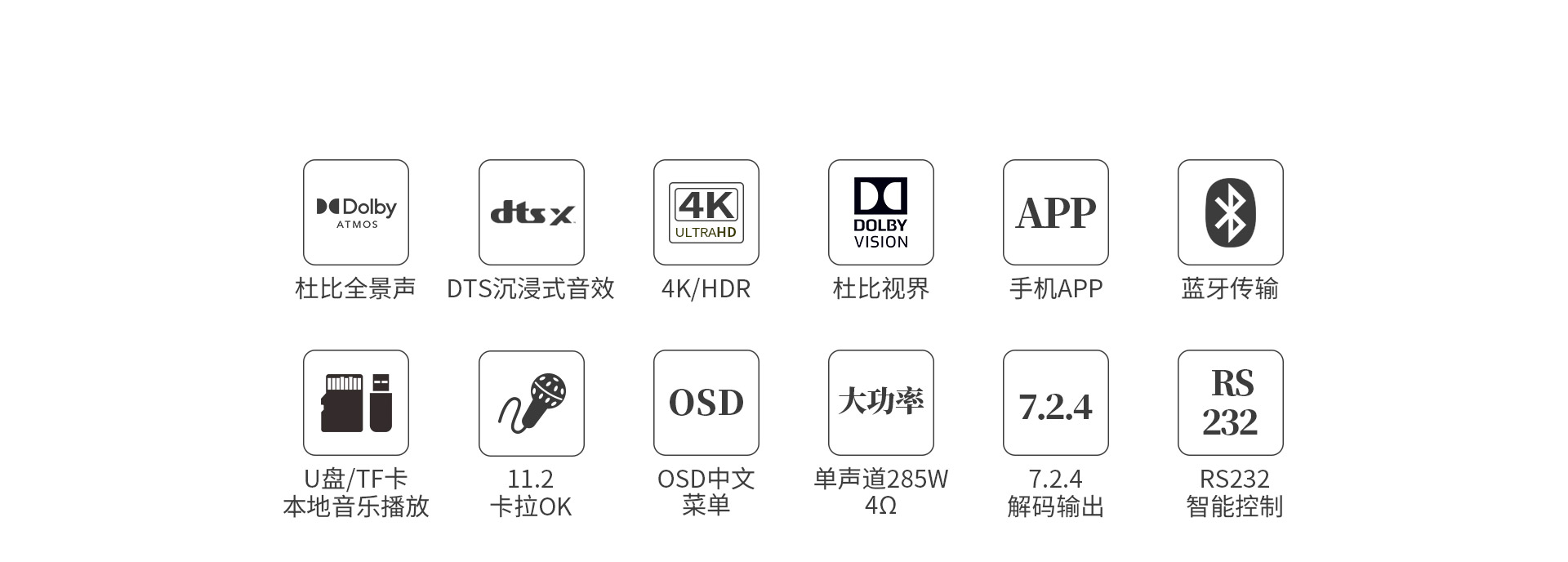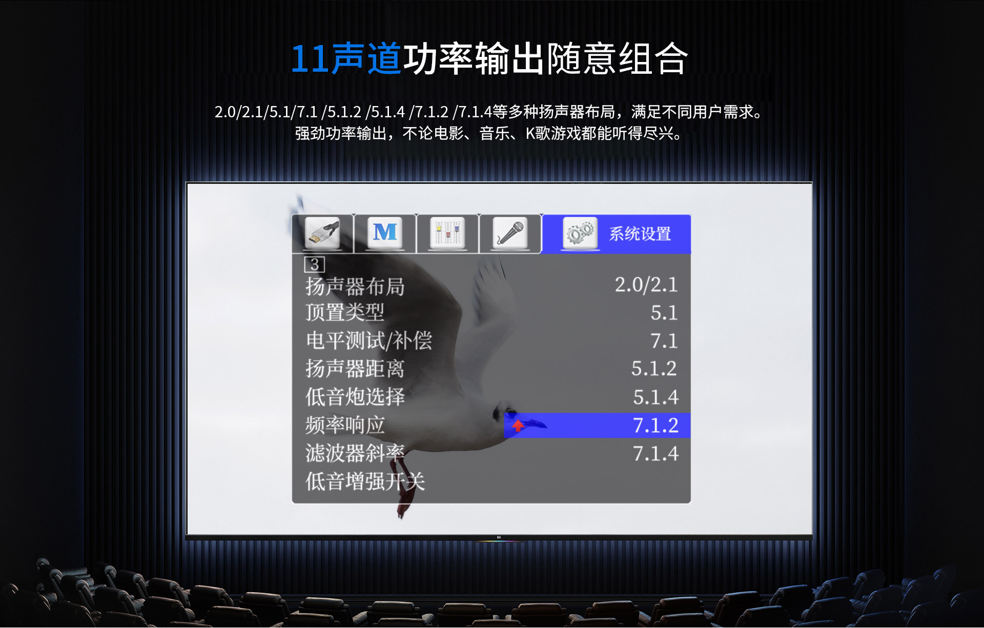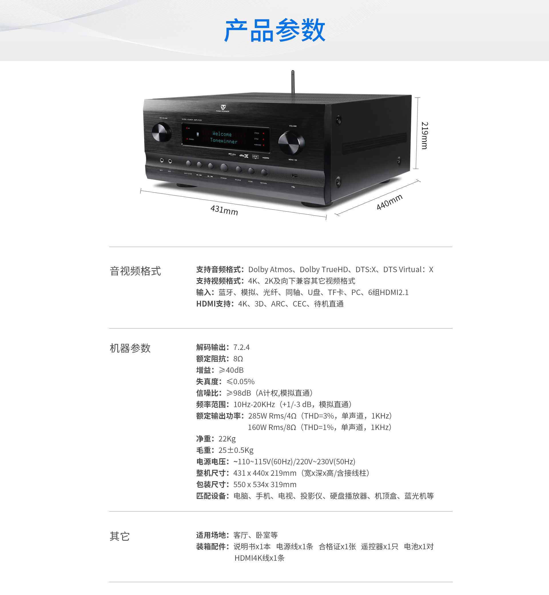 | 一、功能概述: 1.支持Dolby Atmos、DolbyTrue-HD及向下兼容所有杜比音频编码文件; 2.支持DTS:X、DTS-Master及向下兼容所有DTS音频编码文件; 3.支持HDCP2.2; 4.支持4K/60Hz,RGB 4:4:4,18GHz全带宽高清视频信号; 5.支持Dolby Vision及HDR 10高清视频信号; 6.同时支持7.1.4信号输出; 7.内置7.1.4全景声卡拉OK系统,强大的DSP数字混响效果及九级防啸叫移频处理技术,多种人声风格选择; 8.房间EQ、扬声器距离、延时、声压的自动测试及补偿,一键式操作,全自动校正,同时支持用户手动调节; 9.内置蓝牙数字音频接收器; 10.内置高品质音乐播放器;支持TF卡及U盘音频文件播放,支持FLAC、APE、WAV、MP3等多种无损及有损压缩音频格式; 11.支持手机APP操作; 12.全中文叠加式OSD屏幕显示菜单; 13.支持本地音乐信息在手机及电视可同步读取显示,支持多层文件夹管理; 14.支持从2.0声道到7.1.4声道等10多种扬声器配置; 15.支持HDMI 6进2出,2组同轴2组光纤数字音频输入,3组模拟音频输入; 16.支持5.1声道外部混音输入,可外挂混响器; 17.内置11x160W (8Ω, RMS )大功率H类HI-FI功放可直接驱动7.1.4声道配置的扬声器; 18.支持RS232智能控制连接; 19.支持HDMI ARC音频回传,支持CEC控制; 二、产品性能参数: 额定阻抗:8Ω 额定输出功率:285WRms/4Ω(THD=3%,单声道,1KHz) 160WRms/8Ω(THD=1%,单声道,1KHz) 失真度:≤0.05%(A计权模拟直通,1KHz正常工作条件) 频率响应:10Hz-20KHz(+1/-3dB,模拟直通) 增益:≥40dB(模拟直通) 信噪比:≥98dB(A计权,模拟直通) 净重:22Kg 毛重:25Kg 适用测试话筒:ETM-2 电源电压:~110V~115V(60Hz)/220V~230V(50Hz)整机尺寸:431x440x219mm(宽x深x高/含接线柱)11包装尺寸:550x534x319mm(宽x深x高) |